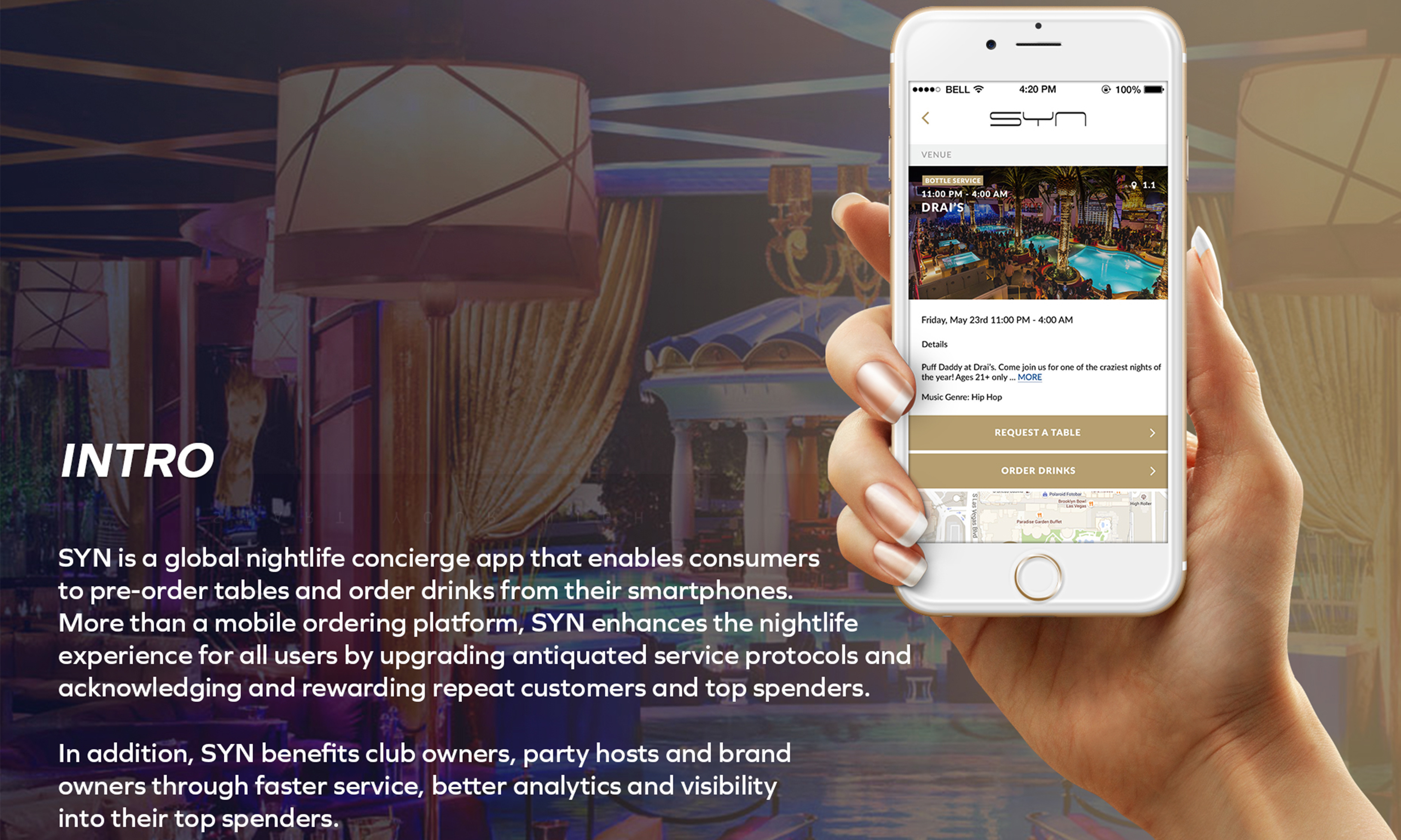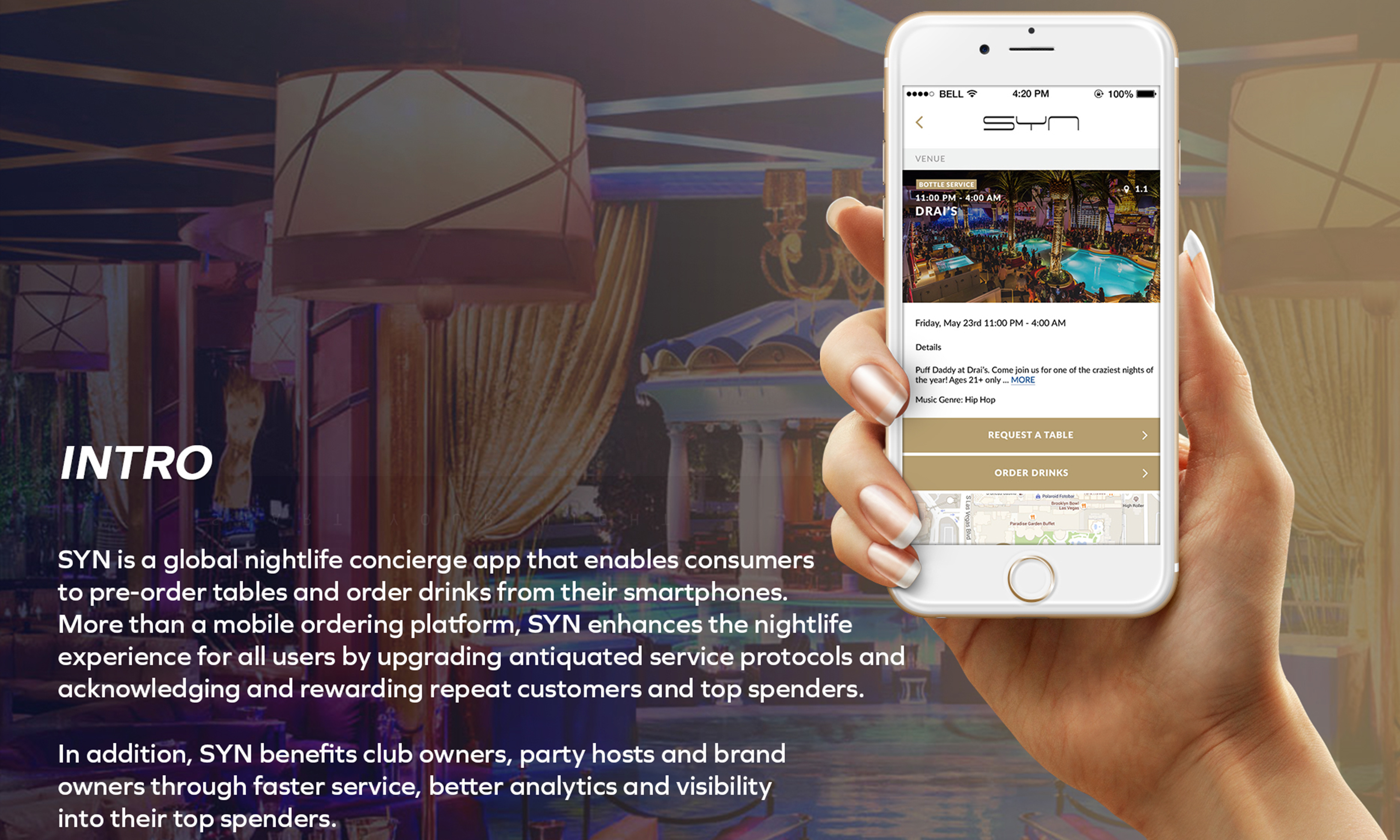 SYN is a global nightlife concierge app that enables consumers to pre-order tables and order drinks from their smartphones.