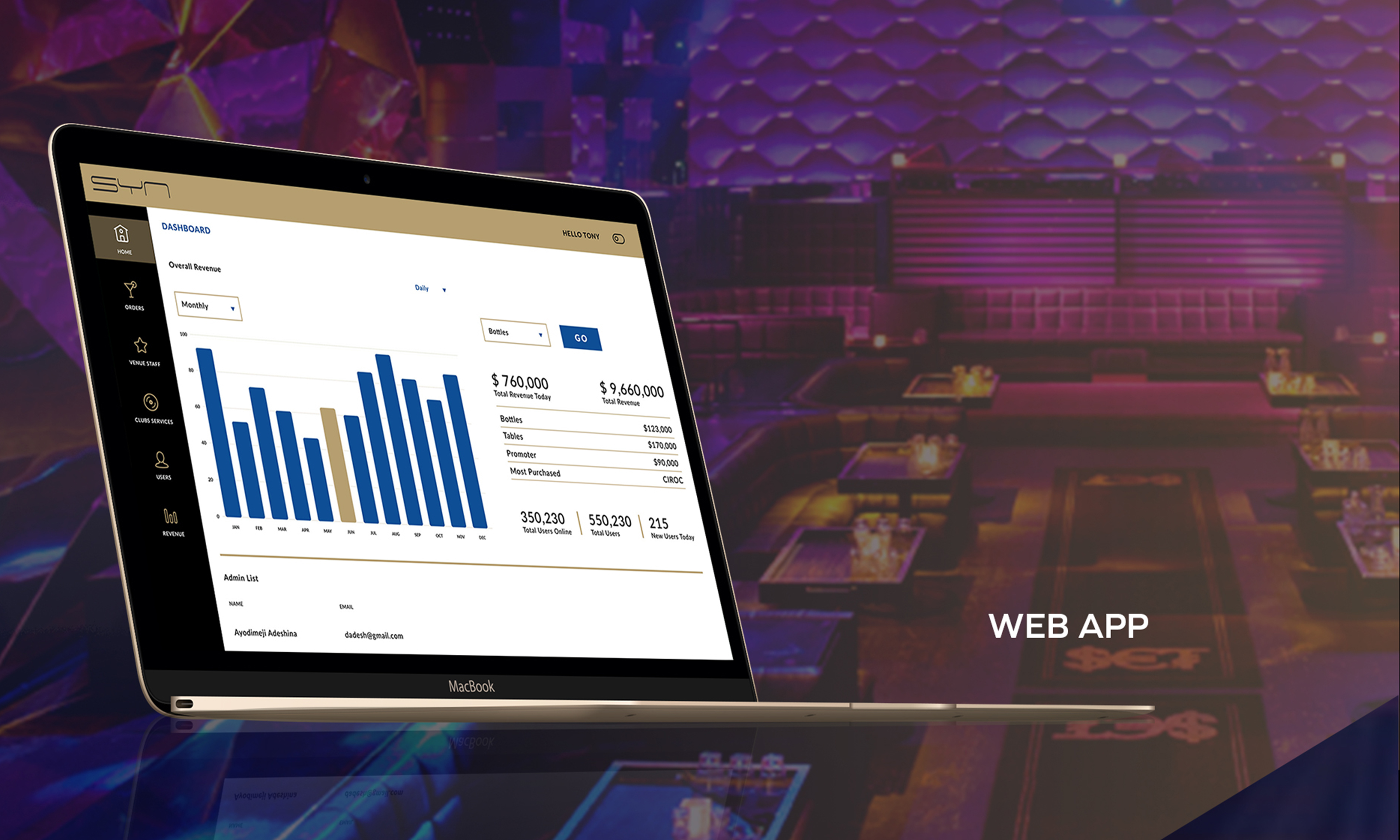 SYN is a global nightlife concierge app that enables consumers to pre-order tables and order drinks from their smartphones. More than a mobile ordering platform, SYN enhances the nightlife experience for all users by upgrading antiquated services protocols and acknowledging and rewarding repeat customers and top spenders. SYN benefits owners, party hosts and brand owners through faster service, better analytics and visibility into their top spenders.
