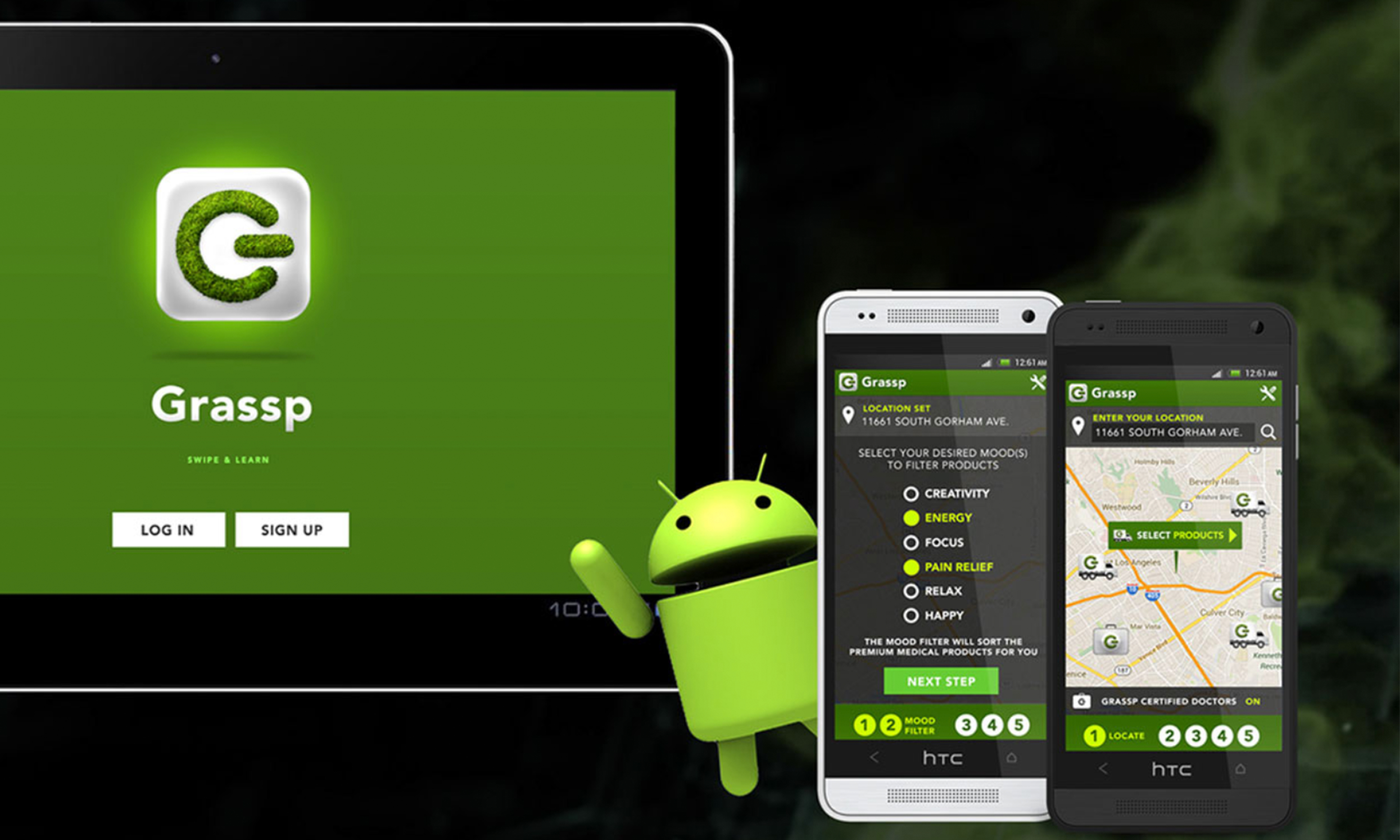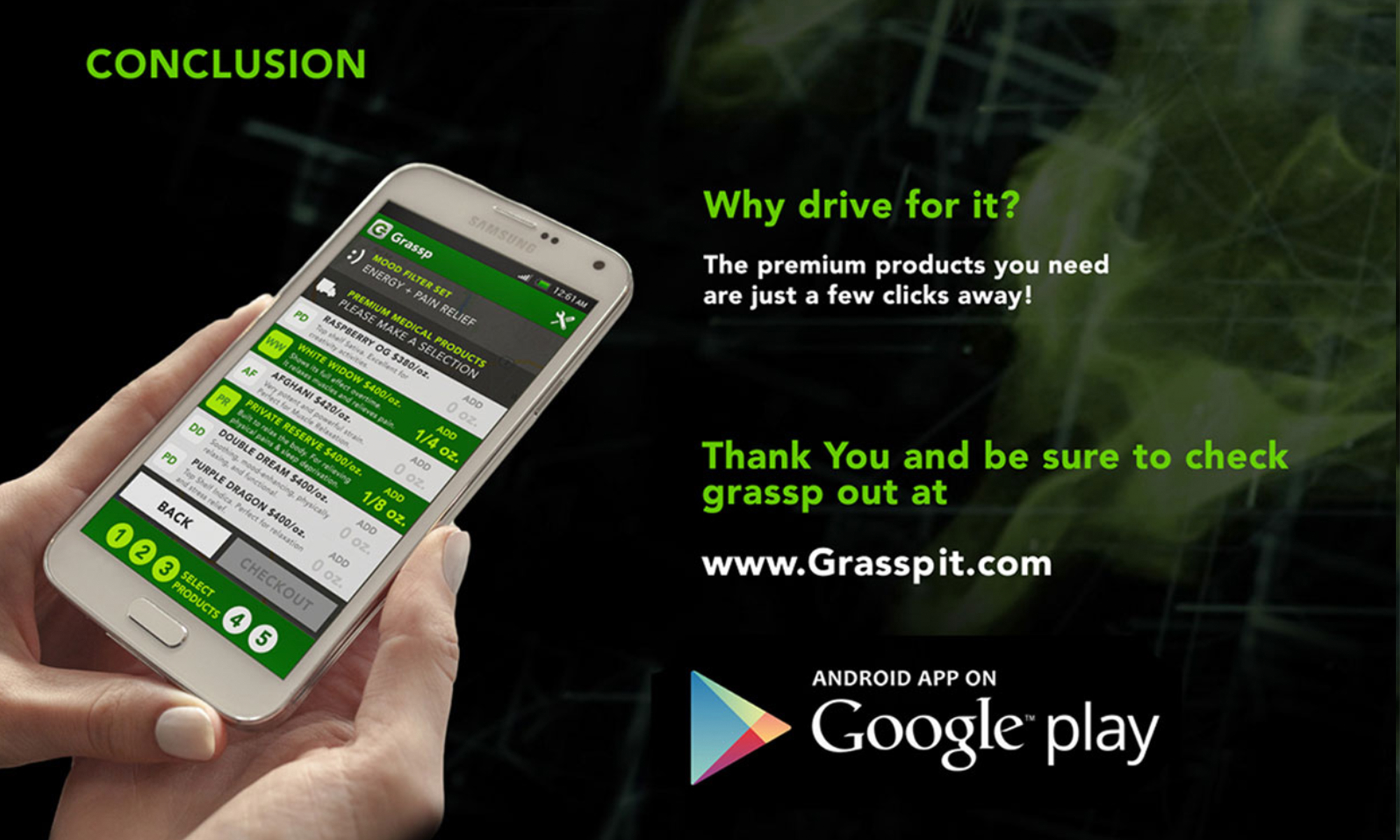 Grassp the Revolution We created Grassp to provide a safer, more convenient path between discerning patients and the highest quality medical cannabis products available. There's no need to drive for it anymore, our on-demand technology gives qualified patients, doctors, and service providers the connectivity and accessibility they need, whenever they need it. As long as you have a doctor's recommendation, our revolutionary cross device platform puts the power in your hands. As a patient and a consumer, you know what you're looking fir and you know when you need it. We help you Grassp it. We hope you'll agree that Grassp is the safest, most convenient way of acquiring your medically recommended cannabis product.