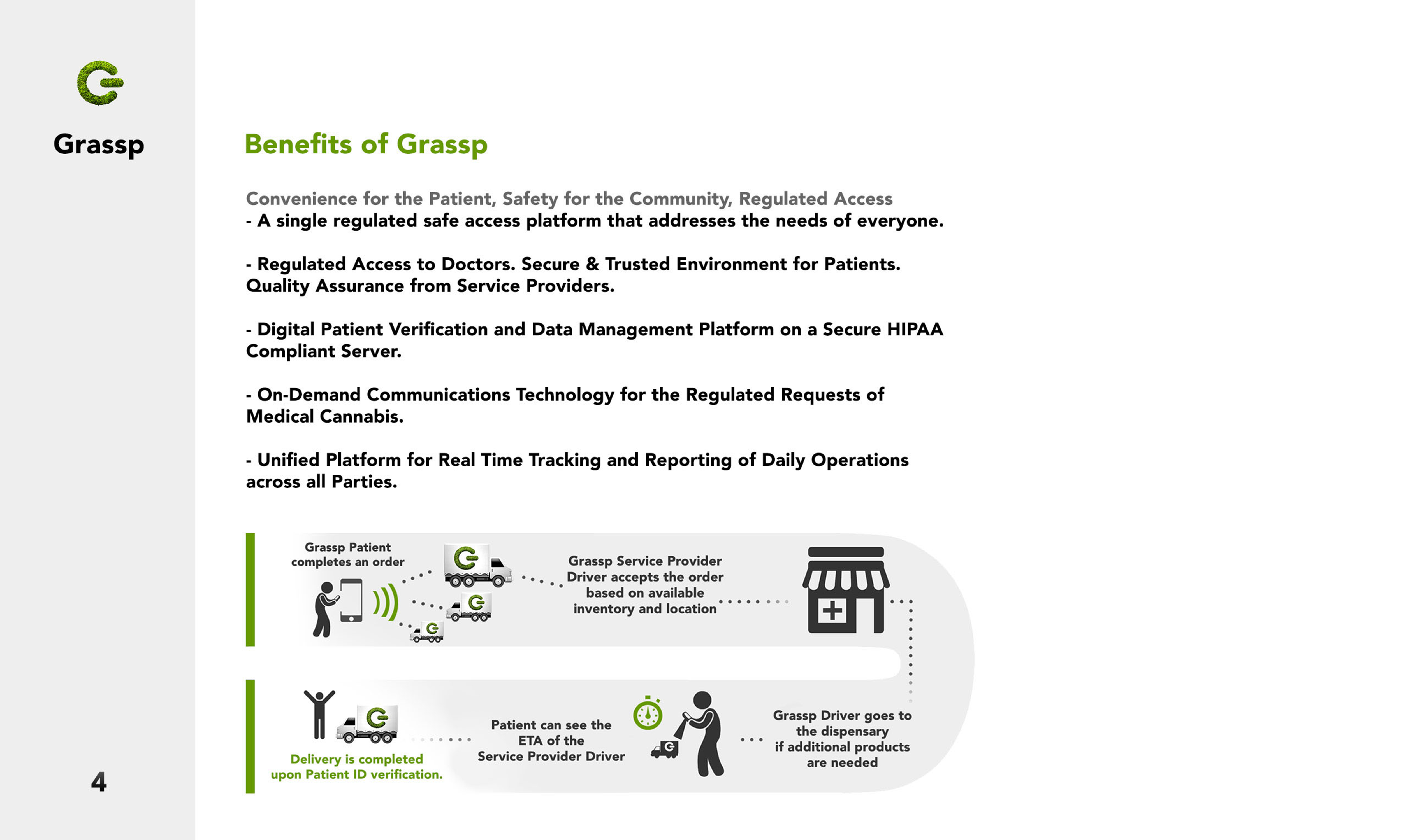 Grassp the Revolution We created Grassp to provide a safer, more convenient path between discerning patients and the highest quality medical cannabis products available. There's no need to drive for it anymore, our on-demand technology gives qualified patients, doctors, and service providers the connectivity and accessibility they need, whenever they need it.